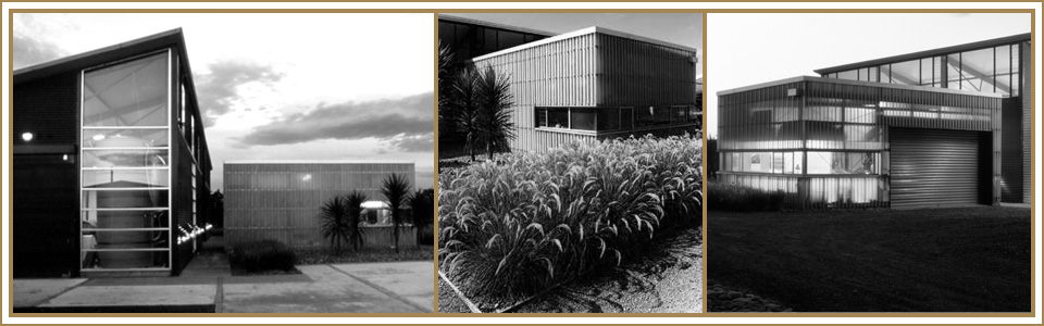 “This is a ‘shed with a view’. The perfectly framed vista of distant vines across the tops of a carefully placed row of lavender provides a ‘nice place to work in’ (said the happy client). This, plus a great-looking vineyard shed flooded with natural light passing through the fibreglass walls, certainly does make for a fantastic work space. The two larger shed forms are used for processing. An open central servicing area between connects the two buildings. Pebble gardens and selective planting successfully formalise the ‘elegant sheds’, completing the careful attention to site and environment.”